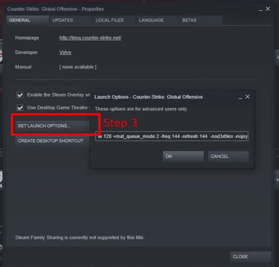 Return to the Steam Library, right click on Counter-Strike Global Offensive and hit properties again. Go under the launch options settings. In the new window, type in cl_disablehtmlmotd 1. Then, save your changes, and restart the game again.